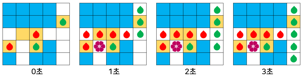 초록색 배양액과 빨간색 배양액이 동일한 시간에 도달한 땅에서는 두 배양액이 합쳐져서 꽃이 피어난다. 꽃이 피어난 땅에서는 배양액이 사라지기 때문에 더 이상 인접한 땅으로 배양액을 퍼트리지 않는다.
