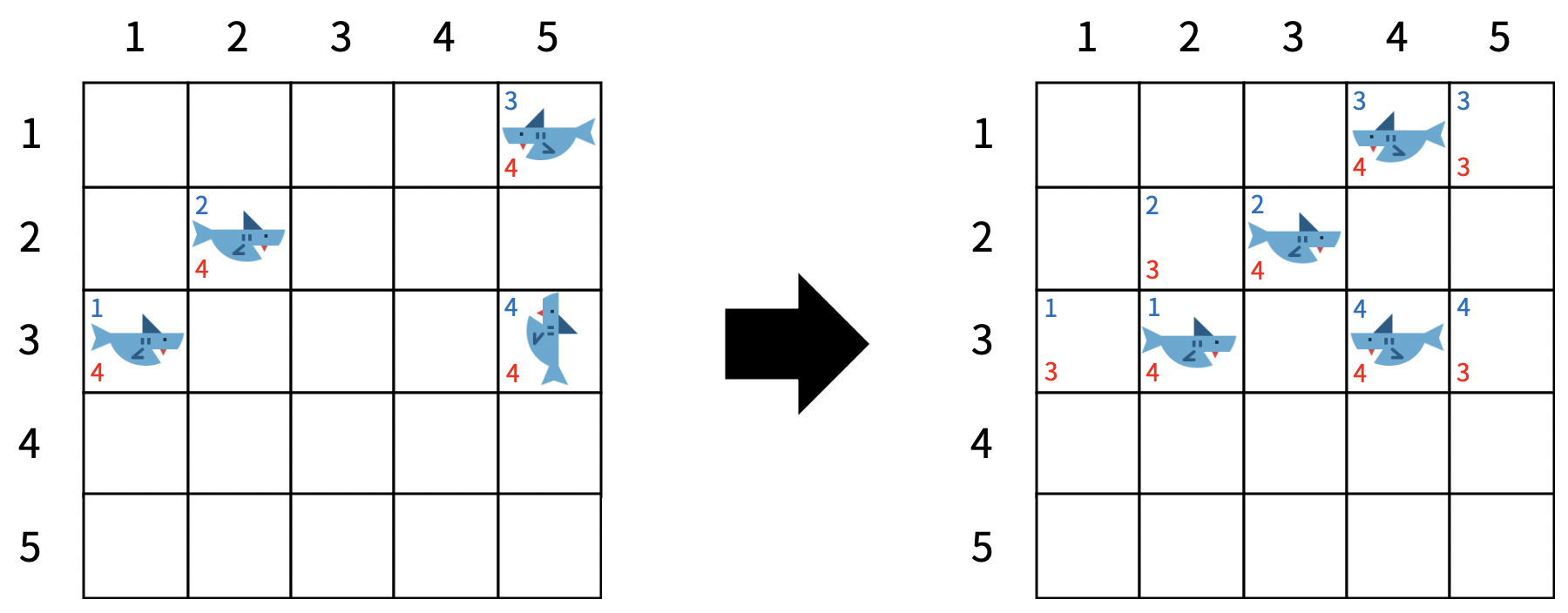 모든 상어가 이동한 후 한 칸에 여러 마리의 상어가 남아 있으면, 가장 작은 번호를 가진 상어를 제외하고 모두 격자 밖으로 쫓겨난다.