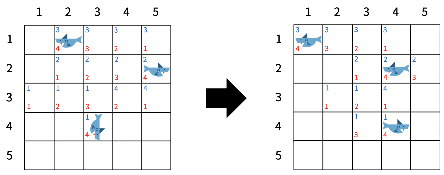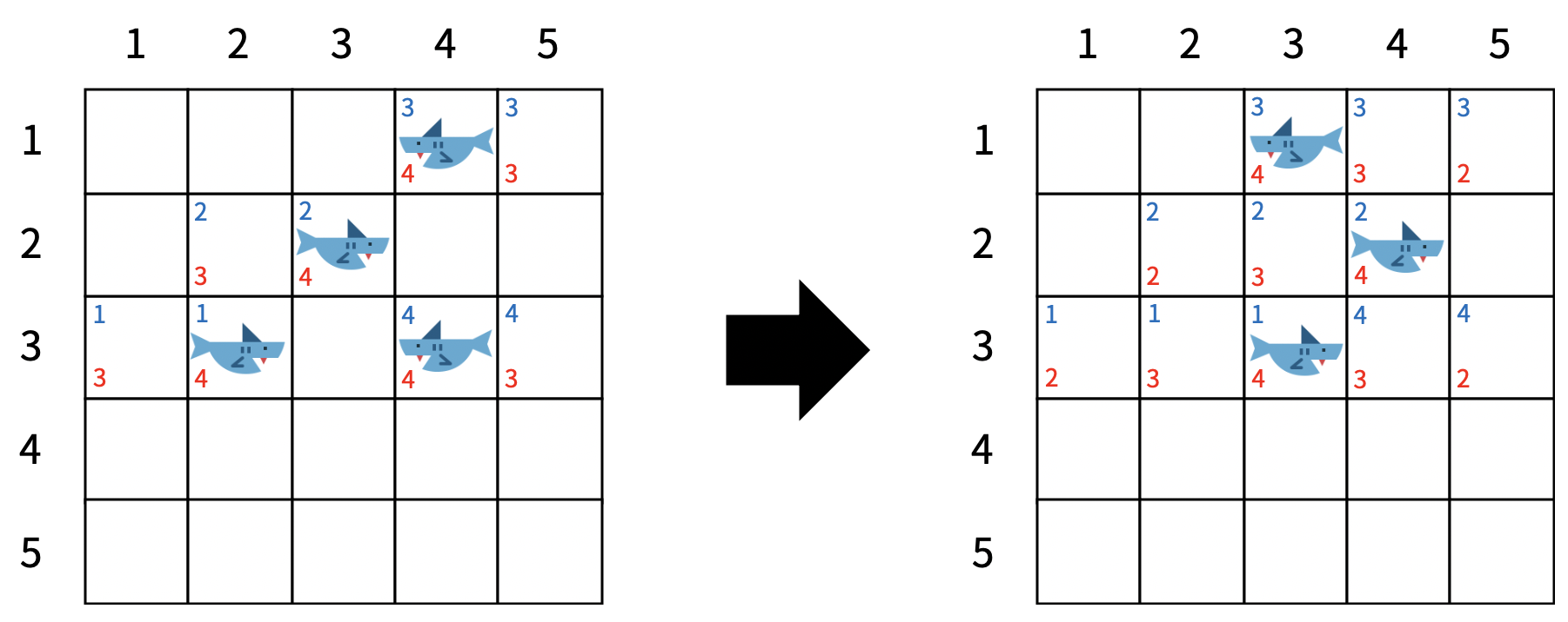 <그림 4>은 격자에 남아있는 모든 상어가 한 칸 이동하고 자신의 냄새를 뿌린 상태, <그림 5>는 <그림 4>에서 한 칸 더 이동한 상태를 나타낸다. 상어 2는 인접한 칸 중에 아무 냄새도 없는 칸이 없으므로 자신의 냄새가 들어있는 (2, 4)으로 이동했다. 상어가 이동한 후에, 맨 처음에 각 상어가 뿌린 냄새는 사라졌다.