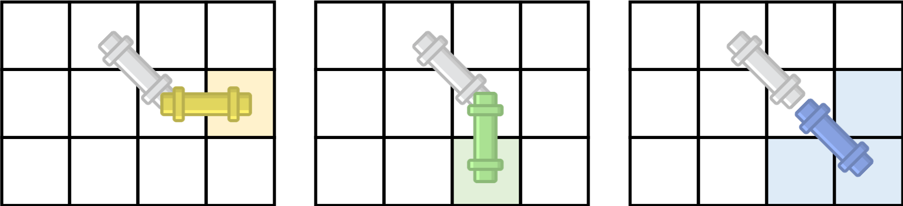 오늘은 집 수리를 위해서 파이프 하나를 옮기려고 한다. 파이프는 아래와 같은 형태이고, 2개의 연속된 칸을 차지하는 크기이다.